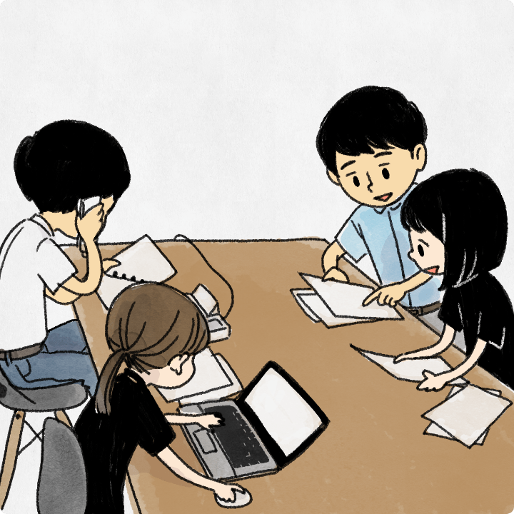 法人マネジメントでは、事業企画・総務・経理・人事・広報などの業務に、それぞれの得意分野を活かしながら取り組んでいます。大小さまざまなプロジェクトを進行するため、各メンバーは複数のプロジェクトに関わりながら業務を行っています。一人で対応するのではなく、チームで取り組む事によって、より質の高いマネジメントを目指しています。